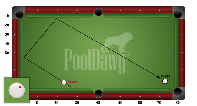 The value on the short rail is half the value of the long rail, and adding those values results in a destination. If your object ball is sitting in the pocket (80), then you find the line that the cue ball is on. For simplicity, I have the cue ball originating out of 30 and going through 50. 30+50=80. You'll want to use a medium speed and hit this shot with about one tip of english, so make sure you grab your favorite chalk and apply some to your cue before trying this one.