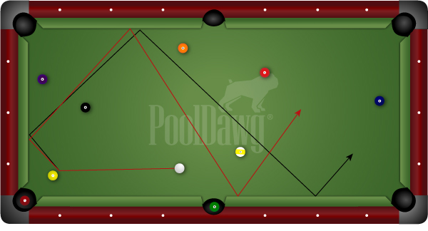 One of the things that intermediate players do all the time is try to move the cue ball around the table using high english with the object ball near the rail. In the diagram the black line shows what they are trying to do, and the red cue ball line shows what really happens. Using that little bit of high right with the object ball near the rail is just asking for trouble.