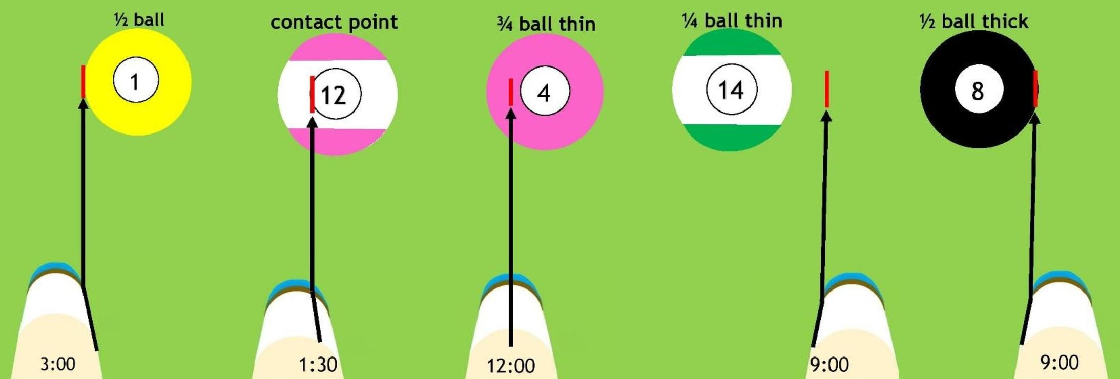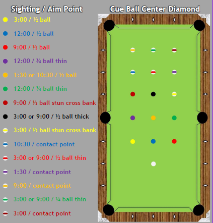 Each of these systems have both sweet and sour spots, or ranges where the system/s work well, and where they don’t. This system incorporates the sweet spots, and leaves out the sour. Also, by combining the systems the sweet spots are multiplied to a degree great enough for me to have created this new aiming system authoritatively. All shots are without spin. Applying spin with composite aiming requires learning technique I instruct in a SPIN session. Below are a few diagrammatic examples of composite aiming: