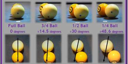 Ball fraction aiming divides the object ball into: ½ ball, ¼ ball, ¾ ball, and full ball. For a ½ ball hit aim at the very edge of the object ball. For a ¾ ball hit, aim midway from the center of the object ball and its very edge. The ¼ ball aim is the most difficult since you must aim at a point in space a ¼ ball outside of the object balls edge. A full ball hit is simply aiming at the center of the object ball.