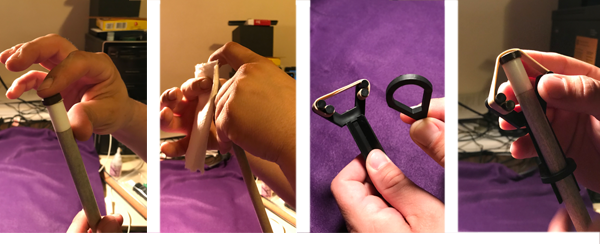 Next, assemble the tip clamp that came with your kit. This clamp slips over the shaft and as you can see in the photo, you simply place the rubber band on the center of the tip and pull the clamp down. Use the slider to hold the clamp in place. Let the glue dry for 10 to 15 minutes.